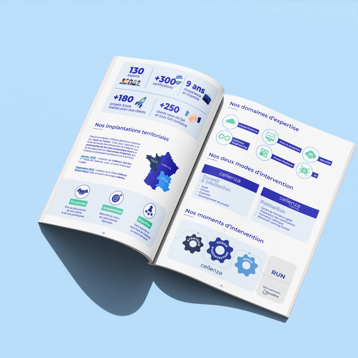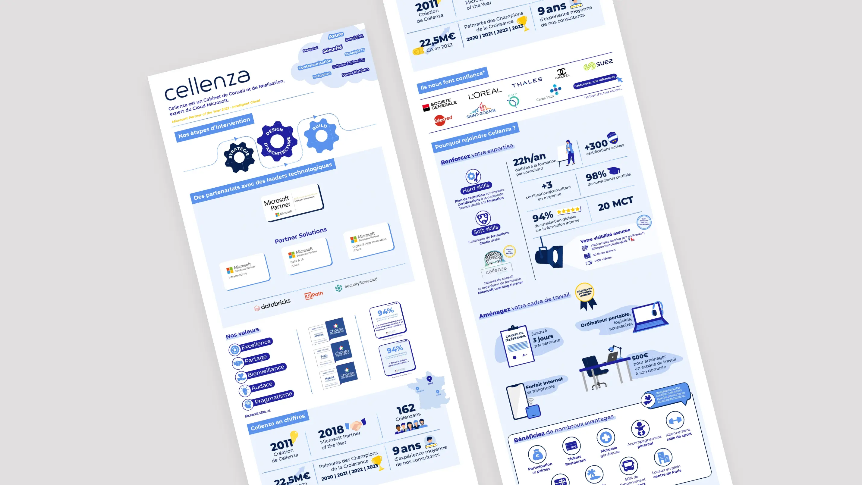 J’ai travaillé avec Cellenza pour concevoir une gamme de supports de communication interne et externe, avec pour objectif de renforcer leur image de marque et d’accompagner leurs équipes au quotidien. Ils souhaitaient des outils clairs et impactants, en adéquation avec leur expertise. J’ai ainsi conçu divers supports RH et présentations PowerPoint, facilitant la communication en interne. Pour valoriser leur présence auprès de leur audience, j’ai également créé des brochures, livres blancs, bannières et contenus pour les réseaux sociaux, ainsi que des vidéos en motion design, dynamisant la présentation de leurs services et captivant leur public cible.
